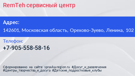 RemTeh, сервисный центр по адресу 142601, Московская область, Орехово-Зуево, Ленина, 102 в дальнейшем Организация, размещена в следующих категориях: