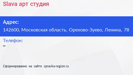 Slava, арт-студия по адресу 142600, Московская область, Орехово-Зуево, Ленина, 78 в дальнейшем Организация, размещена в следующих категориях: