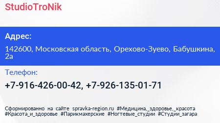 StudioTroNik по адресу 142600, Московская область, Орехово-Зуево, Бабушкина, 2а в дальнейшем Организация, размещена в следующих категориях: