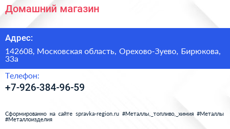 Домашний, магазин по адресу 142608, Московская область, Орехово-Зуево, Бирюкова, 33а в дальнейшем Организация, размещена в следующих категориях:
