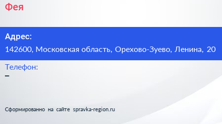 Фея по адресу 142600, Московская область, Орехово-Зуево, Ленина, 20 в дальнейшем Организация, размещена в следующих категориях:
