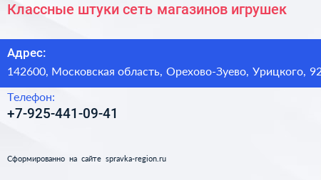Классные штуки, сеть магазинов игрушек по адресу 142600, Московская область, Орехово-Зуево, Урицкого, 92 в дальнейшем Организация, размещена в следующих категориях: