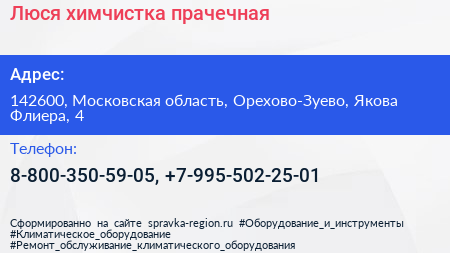 Люся, химчистка-прачечная по адресу 142600, Московская область, Орехово-Зуево, Якова Флиера, 4 в дальнейшем Организация, размещена в следующих категориях: