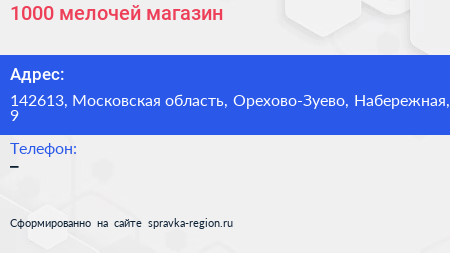 1000 мелочей, магазин по адресу 142613, Московская область, Орехово-Зуево, Набережная, 9 в дальнейшем Организация, размещена в следующих категориях:
