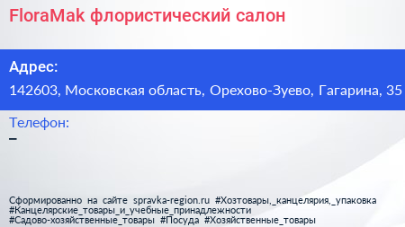 FloraMak, флористический салон по адресу 142603, Московская область, Орехово-Зуево, Гагарина, 35 в дальнейшем Организация, размещена в следующих категориях: