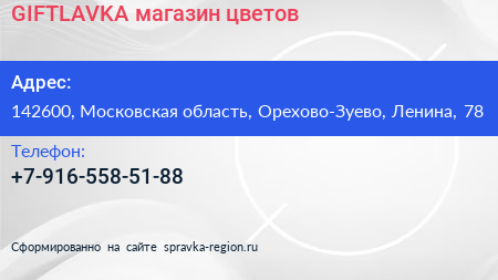 GIFTLAVKA, магазин цветов по адресу 142600, Московская область, Орехово-Зуево, Ленина, 78 в дальнейшем Организация, размещена в следующих категориях: