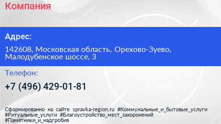 Компания по адресу 142608, Московская область, Орехово-Зуево, Малодубенское шоссе, 3 в дальнейшем Организация, размещена в следующих категориях: