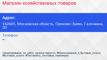 Магазин хозяйственных товаров по адресу 142605, Московская область, Орехово-Зуево, Галочкина, 30 в дальнейшем Организация, размещена в следующих категориях: