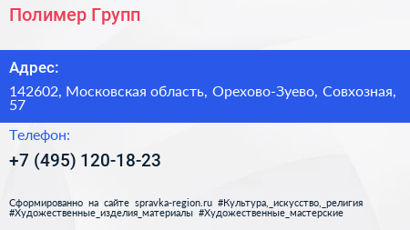 Полимер-Групп по адресу 142602, Московская область, Орехово-Зуево, Совхозная, 57 в дальнейшем Организация, размещена в следующих категориях: