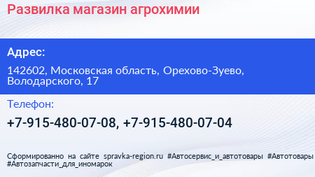Развилка, магазин агрохимии по адресу 142602, Московская область, Орехово-Зуево, Володарского, 17 в дальнейшем Организация, размещена в следующих категориях: