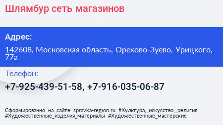 Шлямбур, сеть магазинов по адресу 142608, Московская область, Орехово-Зуево, Урицкого, 77а в дальнейшем Организация, размещена в следующих категориях:
