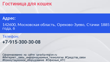 Гостиница для кошек по адресу 142600, Московская область, Орехово-Зуево, Стачки 1885 года, 6 в дальнейшем Организация, размещена в следующих категориях: