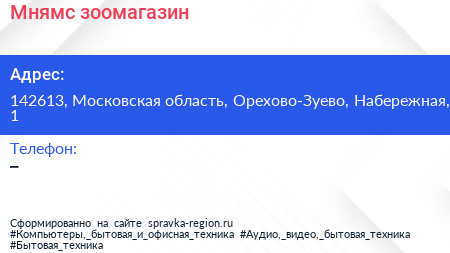 Мнямс, зоомагазин по адресу 142613, Московская область, Орехово-Зуево, Набережная, 1 в дальнейшем Организация, размещена в следующих категориях: