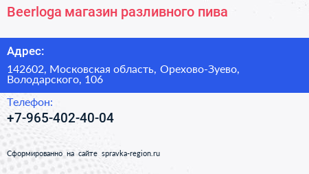 Beerloga, магазин разливного пива по адресу 142602, Московская область, Орехово-Зуево, Володарского, 106 в дальнейшем Организация, размещена в следующих категориях: