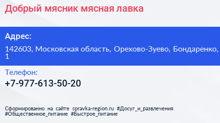 Добрый мясник, мясная лавка по адресу 142603, Московская область, Орехово-Зуево, Бондаренко, 1 в дальнейшем Организация, размещена в следующих категориях: