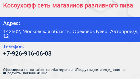 Косоухофф, сеть магазинов разливного пива по адресу 142602, Московская область, Орехово-Зуево, Автопроезд, 12 в дальнейшем Организация, размещена в следующих категориях: