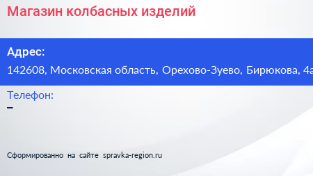 Магазин колбасных изделий по адресу 142608, Московская область, Орехово-Зуево, Бирюкова, 4а в дальнейшем Организация, размещена в следующих категориях: