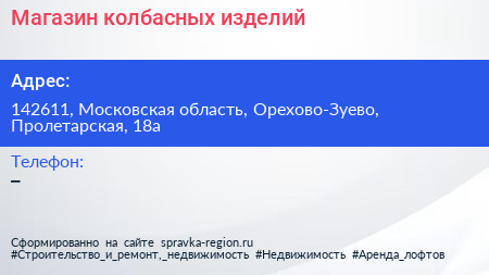 Магазин колбасных изделий по адресу 142611, Московская область, Орехово-Зуево, Пролетарская, 18а в дальнейшем Организация, размещена в следующих категориях: