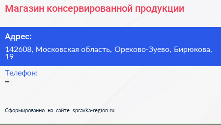 Магазин консервированной продукции по адресу 142608, Московская область, Орехово-Зуево, Бирюкова, 19 в дальнейшем Организация, размещена в следующих категориях: