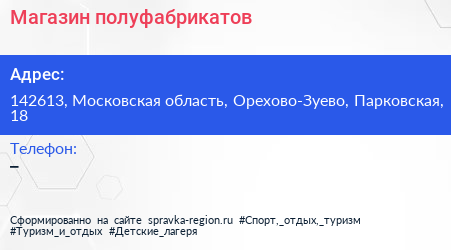 Магазин полуфабрикатов по адресу 142613, Московская область, Орехово-Зуево, Парковская, 18 в дальнейшем Организация, размещена в следующих категориях: