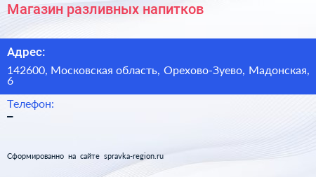 Магазин разливных напитков по адресу 142600, Московская область, Орехово-Зуево, Мадонская, 6 в дальнейшем Организация, размещена в следующих категориях: