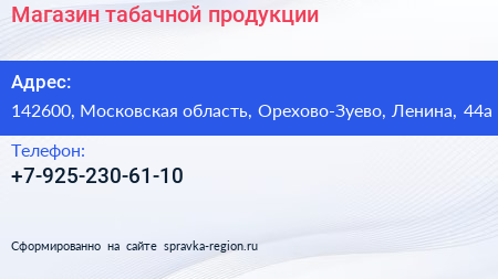 Магазин табачной продукции по адресу 142600, Московская область, Орехово-Зуево, Ленина, 44а в дальнейшем Организация, размещена в следующих категориях: