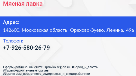 Мясная лавка по адресу 142600, Московская область, Орехово-Зуево, Ленина, 49а в дальнейшем Организация, размещена в следующих категориях: