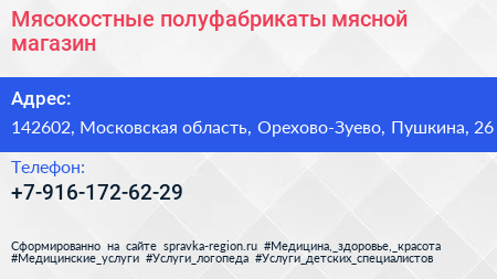 Мясокостные полуфабрикаты, мясной магазин по адресу 142602, Московская область, Орехово-Зуево, Пушкина, 26 в дальнейшем Организация, размещена в следующих категориях: