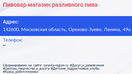 Пивовар, магазин разливного пива по адресу 142600, Московская область, Орехово-Зуево, Ленина, 49а в дальнейшем Организация, размещена в следующих категориях: