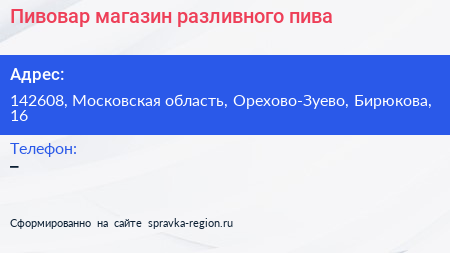Пивовар, магазин разливного пива по адресу 142608, Московская область, Орехово-Зуево, Бирюкова, 16 в дальнейшем Организация, размещена в следующих категориях: