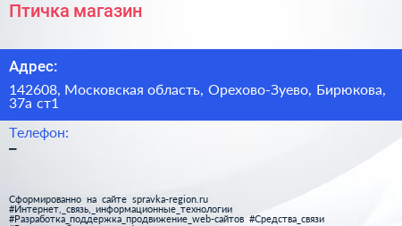 Птичка, магазин по адресу 142608, Московская область, Орехово-Зуево, Бирюкова, 37а ст1 в дальнейшем Организация, размещена в следующих категориях: