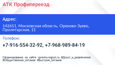 АТК-Профипереезд по адресу 142611, Московская область, Орехово-Зуево, Пролетарская, 11 в дальнейшем Организация, размещена в следующих категориях: