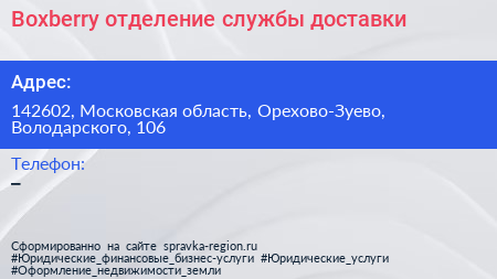 Boxberry, отделение службы доставки по адресу 142602, Московская область, Орехово-Зуево, Володарского, 106 в дальнейшем Организация, размещена в следующих категориях: