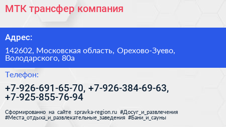 МТК-трансфер, компания по адресу 142602, Московская область, Орехово-Зуево, Володарского, 80а в дальнейшем Организация, размещена в следующих категориях: