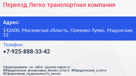 Переезд-Легко, транспортная компания по адресу 142600, Московская область, Орехово-Зуево, Мадонская, 12 в дальнейшем Организация, размещена в следующих категориях: