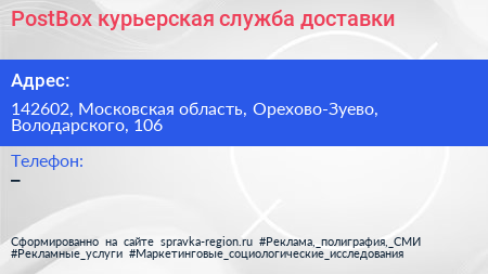 PostBox, курьерская служба доставки по адресу 142602, Московская область, Орехово-Зуево, Володарского, 106 в дальнейшем Организация, размещена в следующих категориях: