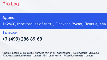 Pro.Log по адресу 142600, Московская область, Орехово-Зуево, Ленина, 44а в дальнейшем Организация, размещена в следующих категориях: