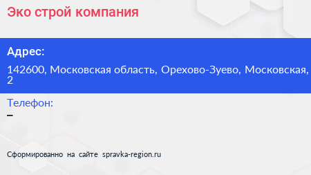 Эко строй, компания по адресу 142600, Московская область, Орехово-Зуево, Московская, 2 в дальнейшем Организация, размещена в следующих категориях: