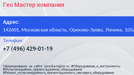 Гео Мастер, компания по адресу 142601, Московская область, Орехово-Зуево, Ленина, 105а в дальнейшем Организация, размещена в следующих категориях: