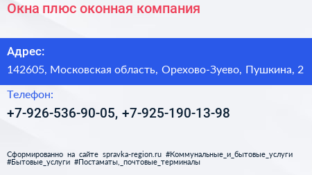 Окна плюс, оконная компания по адресу 142605, Московская область, Орехово-Зуево, Пушкина, 2 в дальнейшем Организация, размещена в следующих категориях: