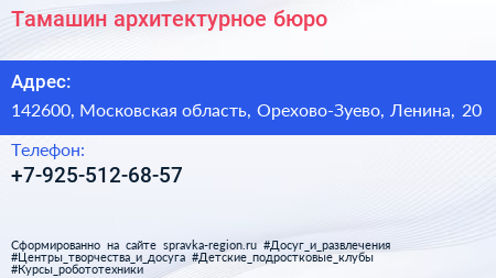 Тамашин, архитектурное бюро по адресу 142600, Московская область, Орехово-Зуево, Ленина, 20 в дальнейшем Организация, размещена в следующих категориях: