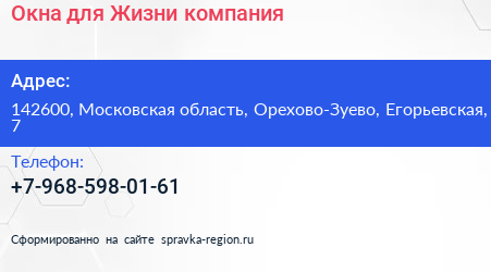 Окна для Жизни, компания по адресу 142600, Московская область, Орехово-Зуево, Егорьевская, 7 в дальнейшем Организация, размещена в следующих категориях: