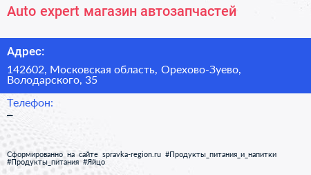 Auto expert, магазин автозапчастей по адресу 142602, Московская область, Орехово-Зуево, Володарского, 35 в дальнейшем Организация, размещена в следующих категориях: