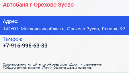 Автобаня, г. Орехово-Зуево по адресу 142601, Московская область, Орехово-Зуево, Ленина, 97 в дальнейшем Организация, размещена в следующих категориях: