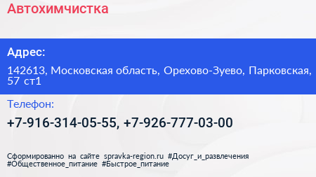 Автохимчистка по адресу 142613, Московская область, Орехово-Зуево, Парковская, 57 ст1 в дальнейшем Организация, размещена в следующих категориях: