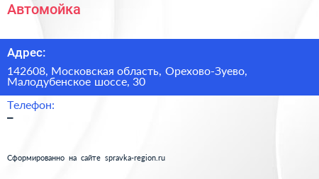 Автомойка по адресу 142608, Московская область, Орехово-Зуево, Малодубенское шоссе, 30 в дальнейшем Организация, размещена в следующих категориях: