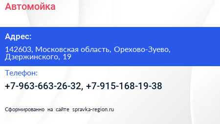 Автомойка по адресу 142603, Московская область, Орехово-Зуево, Дзержинского, 19 в дальнейшем Организация, размещена в следующих категориях:
