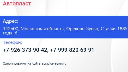 Автопласт по адресу 142600, Московская область, Орехово-Зуево, Стачки 1885 года, 6 в дальнейшем Организация, размещена в следующих категориях: