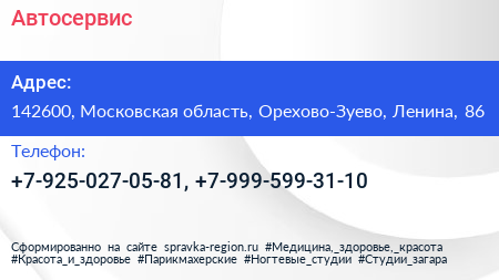 Автосервис по адресу 142600, Московская область, Орехово-Зуево, Ленина, 86 в дальнейшем Организация, размещена в следующих категориях: