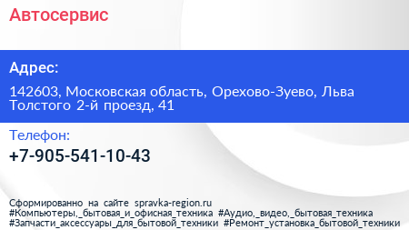 Автосервис по адресу 142603, Московская область, Орехово-Зуево, Льва Толстого 2-й проезд, 41 в дальнейшем Организация, размещена в следующих категориях:
